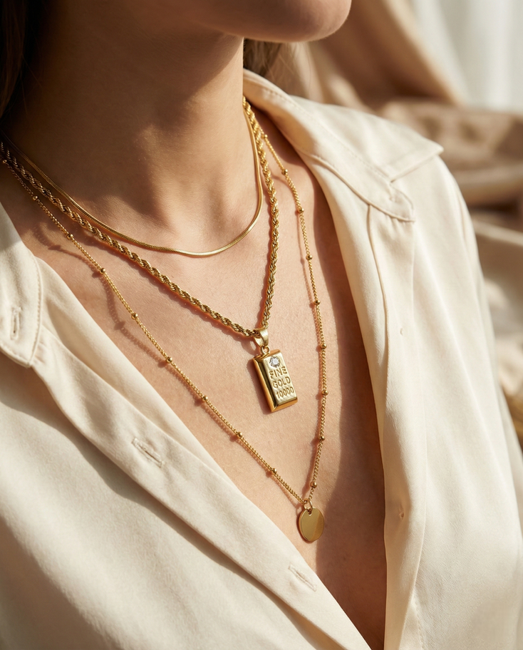Zenginliğin ve klasik şıklığın simgesi olan külçe altın formu, boynunuzda göz alıcı bir aksesuara dönüşüyor. Parlak altın tonundaki bu özel tasarım kolye, üzerindeki 'FINE GOLD' işlemesi ve gerçekçi külçe detaylarıyla lüks bir duruş sergiliyor. Tasarımın köşesine yerleştirilmiş tek taş zirkon, ışığı mükemmel bir şekilde yansıtarak kolyeye zarif bir pırıltı katıyor. Sağlam ve estetik burgu zinciriyle tamamlanan bu iddialı parça, hem günlük kombinlerinizi bir üst seviyeye taşıyacak hem de özel davetlerde tüm bakışları üzerinize çekecek. Kendinize veya sevdiklerinize 'değerli' hissettirecek zamansız bir hediye.