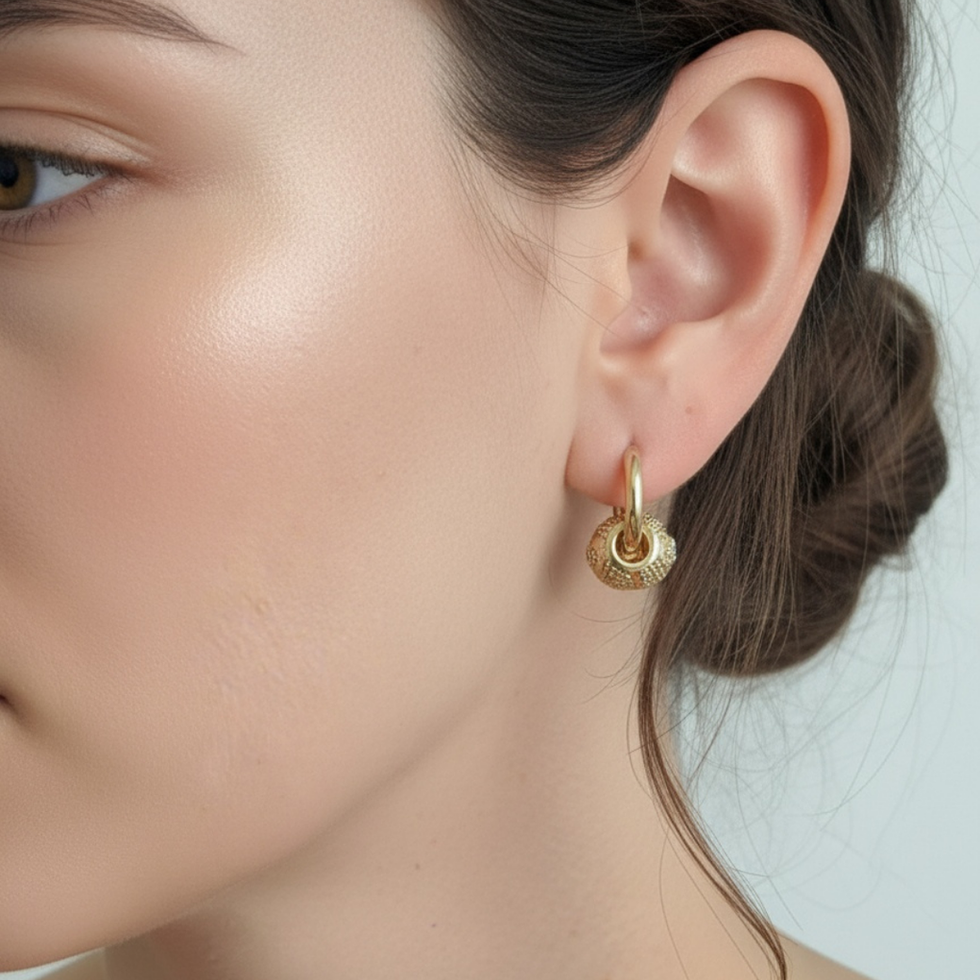 göz detaylı sallantılı fıçı küpe altın rengiyle göz kamaştırıcı bir parıltı kazandırırken, kulağa yerleşimi şık bir odak noktası sunuyor.