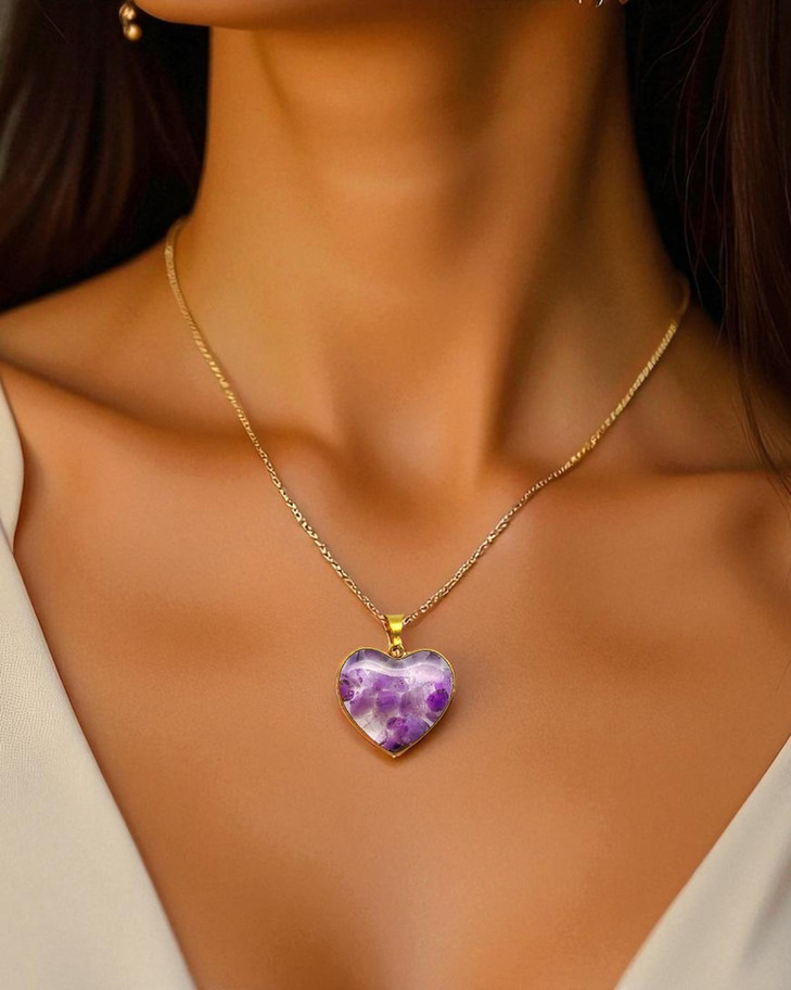 Işıkta renk değiştiren kalp kolye altın rengi zinciriyle göz kamaştırıcı bir parıltı kazandırırken, boyuna yerleşimi şık bir odak noktası sunuyor.