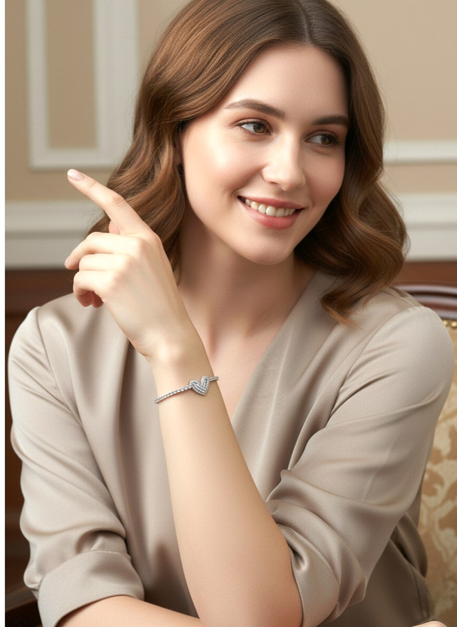 - Kalp zirkon taşlı bileklik gümüş rengiyle göz kamaştırıcı bir parıltı kazandırırken, bileğe yerleşimi şık bir odak noktası sunuyor.