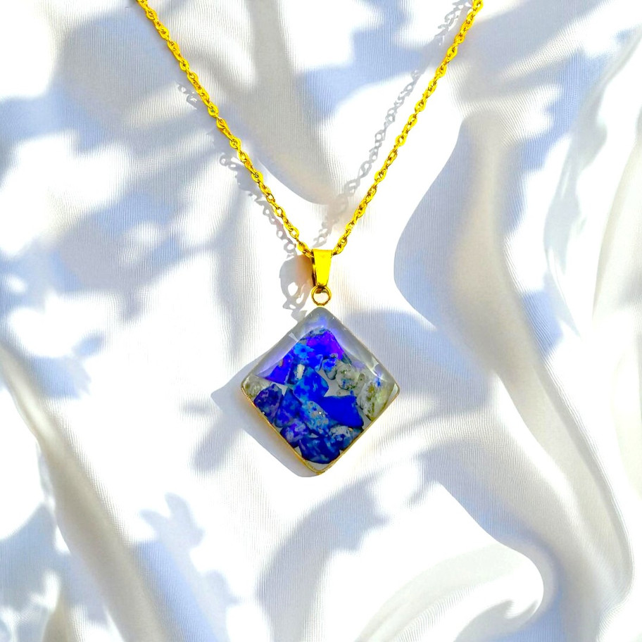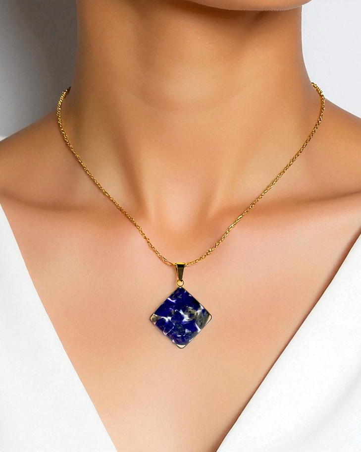 Işıkta renk değiştiren kare kolye altın rengi zinciriyle göz kamaştırıcı bir parıltı kazandırırken, boyuna yerleşimi şık bir odak noktası sunuyor.