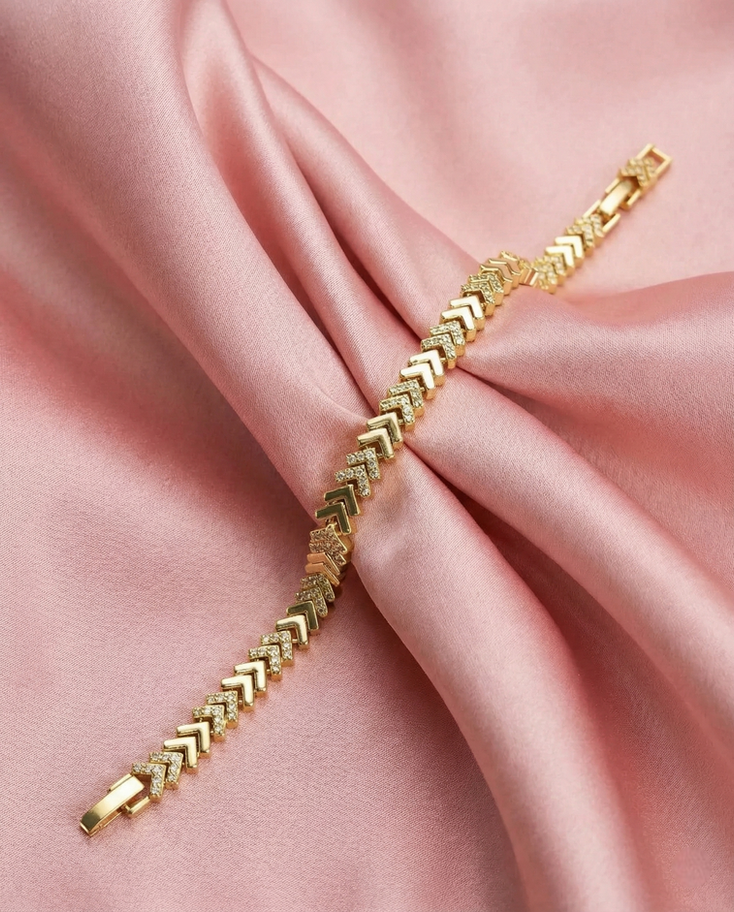 Bu zarif bileklik, modern ve şık tasarımıyla dikkat çekiyor. Her biri özenle işlenmiş, göz kamaştıran taşlarla bezenmiş altın renkli ok motifleri, bilekliğe dinamik bir hava katıyor.