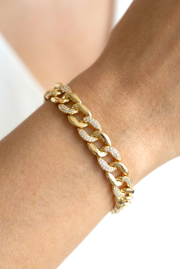 Zarif altın kaplama ve ışıltılı zirkon taşlarla bezeli bu göz alıcı gurmet bileklik, her kombine modern bir lüks dokunuşu ekler. Kusursuz işçiliği ve parlaklığı özel günlerinizde ve günlük kullanımda şıklığınızı tamamlar. Kendinize veya sevdiklerinize unutulmaz bir hediye.