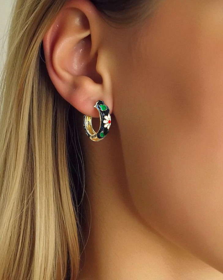 Bu premium küpe, lacivert çiçek desenli halka küpe tasarımı ve modern detaylarıyla her sezonun favorileri arasında yerini alıyor.