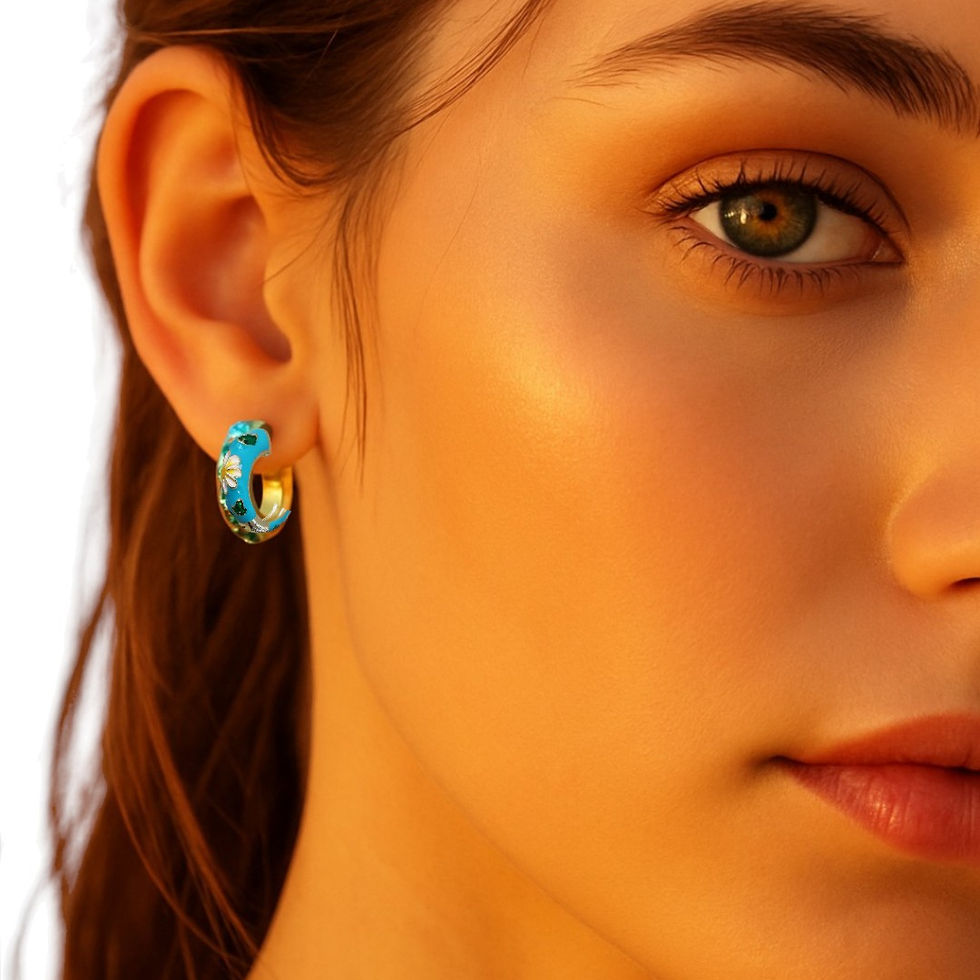 Bu premium küpe, turkuaz çiçek desenli halka küpe tasarımı ve modern detaylarıyla her sezonun favorileri arasında yerini alıyor.