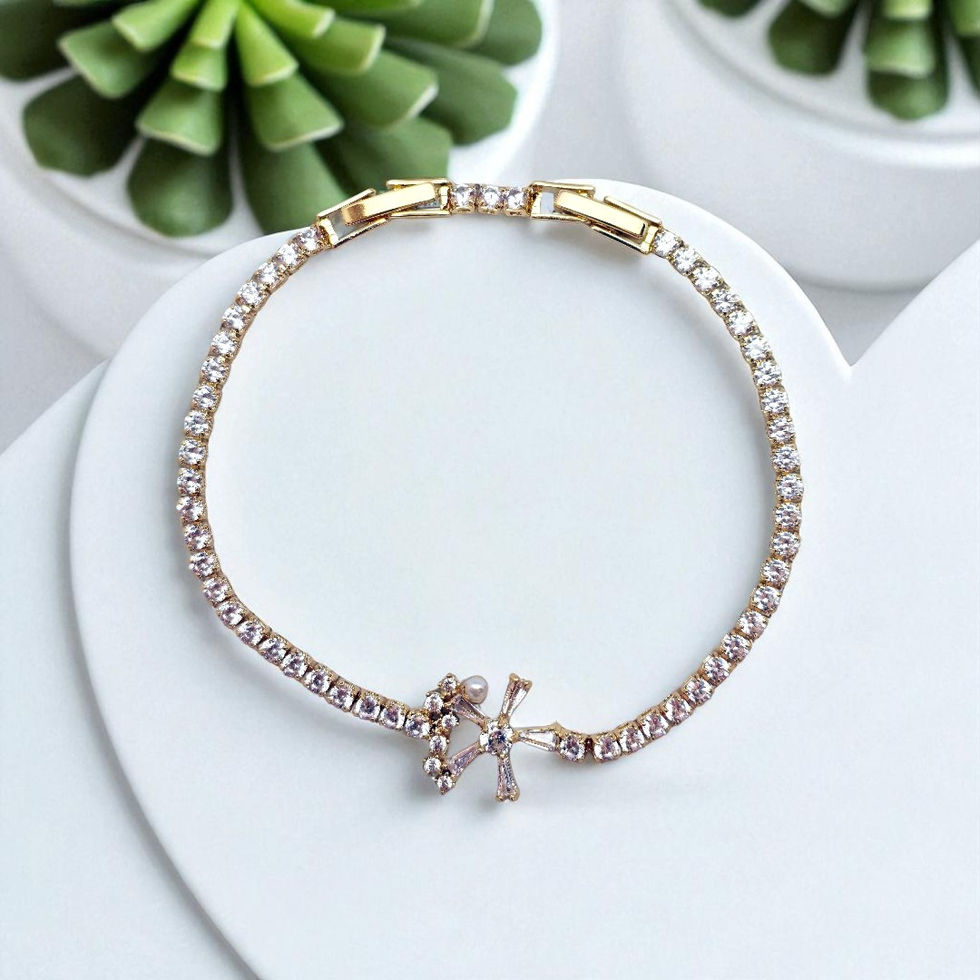 Polen inci zirkon taşlı bileklik altın rengiyle göz kamaştırıcı bir parıltı kazandırırken, bileğe yerleşimi şık bir odak noktası sunuyor.