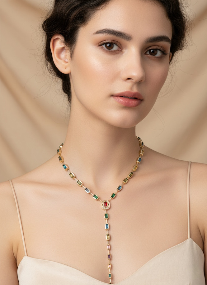 Bu premium Y kolye, baget taşlarla işlenmiş merkezinde bulunan kırmızı taşlı tasarımı ve modern detaylarıyla her sezonun favorileri arasında yerini alıyor.