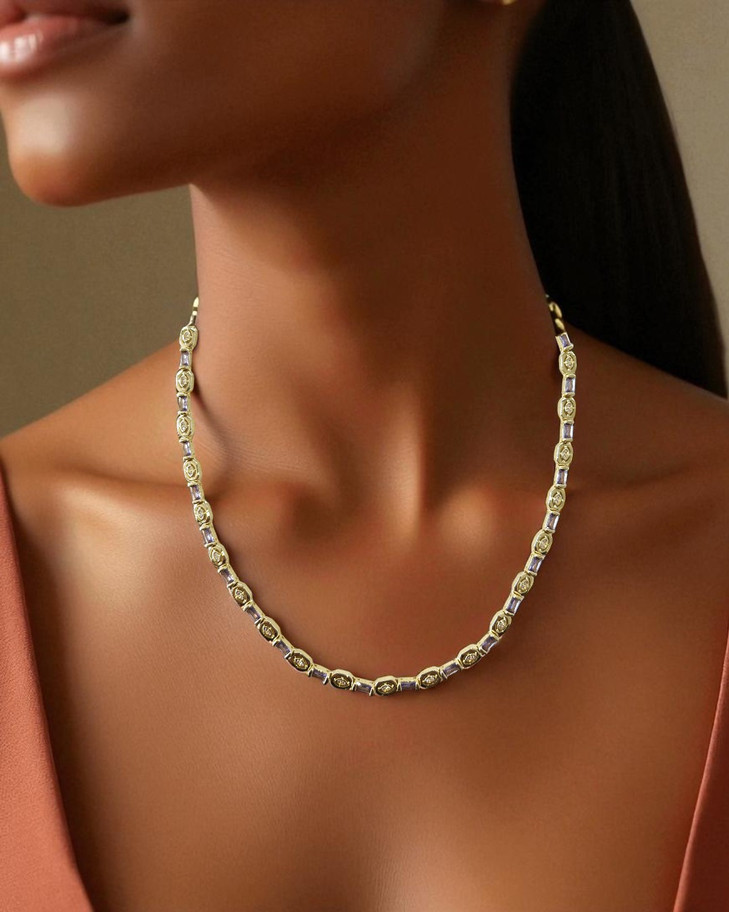 Bu premium kolye, baget taşlarla işlenmiş sıra tasarımı ve modern detaylarıyla her sezonun favorileri arasında yerini alıyor.