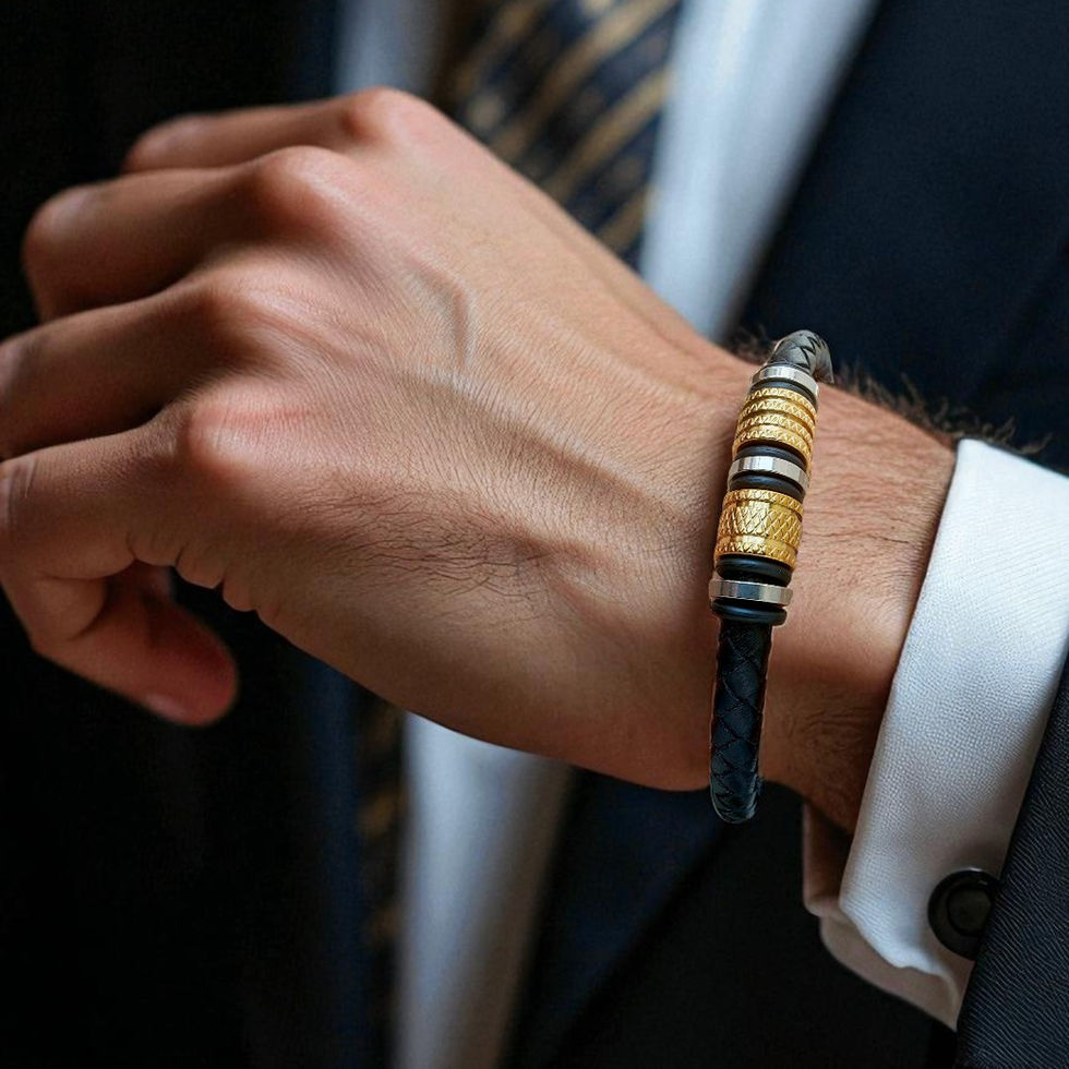 Vintage Çelik işlemeli manyetik klipsli deri bileklik altın ve gümüş rengiyle göz kamaştırıcı bir parıltı kazandırırken, bileğe yerleşimi şık bir odak noktası sunuyor.