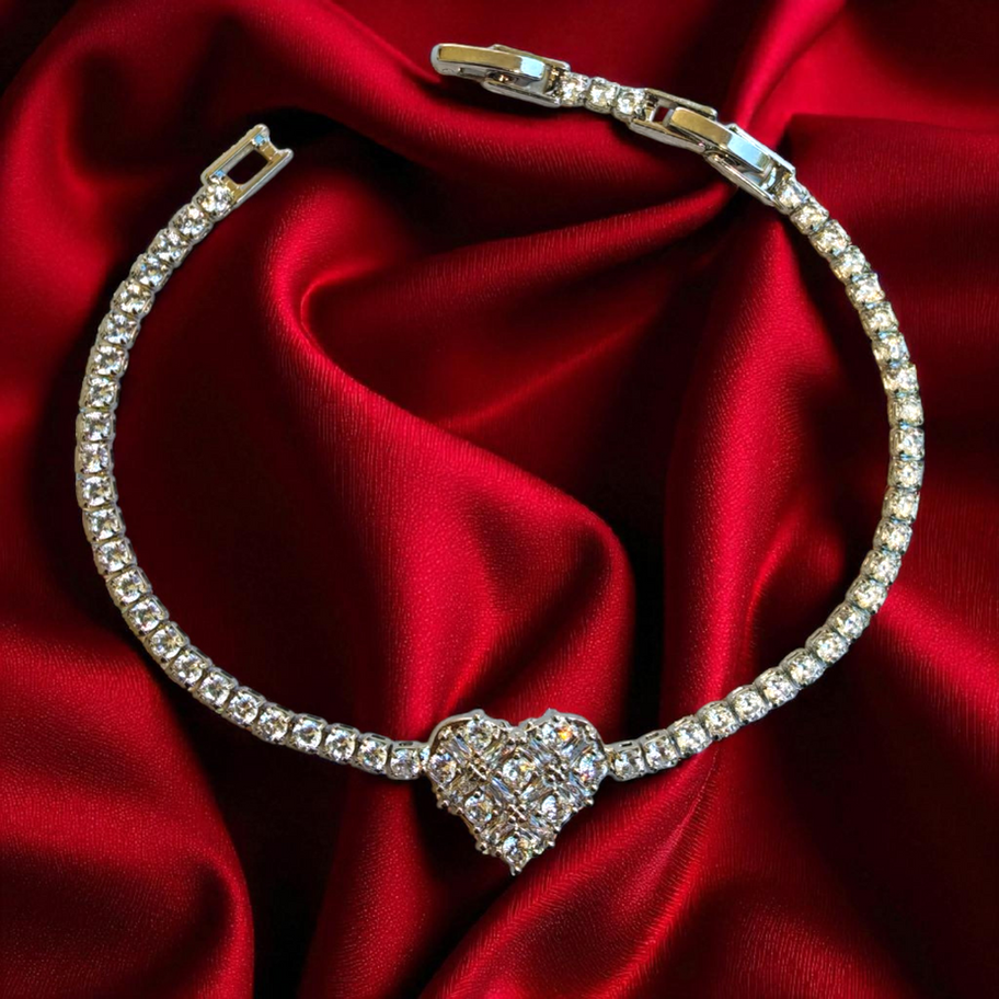 - Kalp zirkon taşlı bileklik gümüş rengiyle göz kamaştırıcı bir parıltı kazandırırken, bileğe yerleşimi şık bir odak noktası sunuyor.