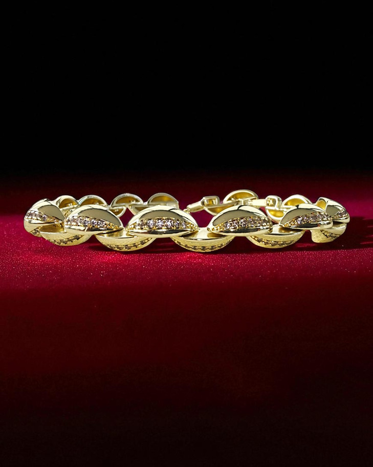 Çift sıra zirkon taşlı bileklik altın rengiyle göz kamaştırıcı bir parıltı kazandırırken, bileğe yerleşimi şık bir odak noktası sunuyor.
