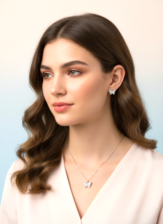 - Bu premium kombin kolye ve küpe, zirkon taşlarla işlenmiş içe büküm kelebek tasarımı ve modern detaylarıyla her sezonun favorileri arasında yerini alıyor.