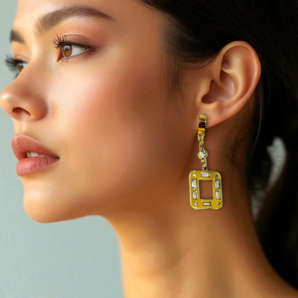 Zirkon Taşlı Sallantılı Kare Küpe Altın Rengi küpe göz kamaştırıcı bir parıltı kazandırırken, kulağa yerleşimi şık bir odak noktası sunuyor.