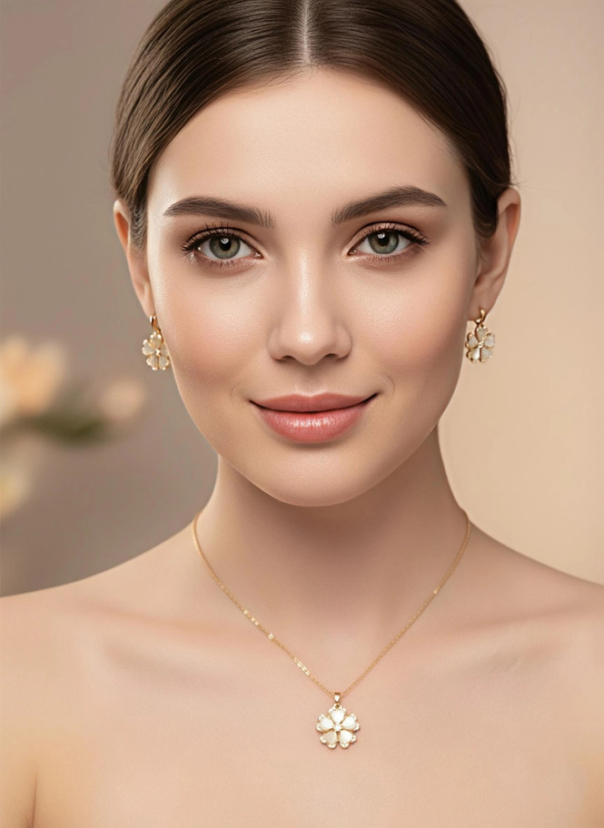 Zirkon taşlarla süslenmiş kombin kolye ve küpe yonca tasarımı ve altın rengiyle göz kamaştırıcı bir parıltı kazandırırken, kulağa ve boyna yerleşimi şık bir odak noktası sunuyor.