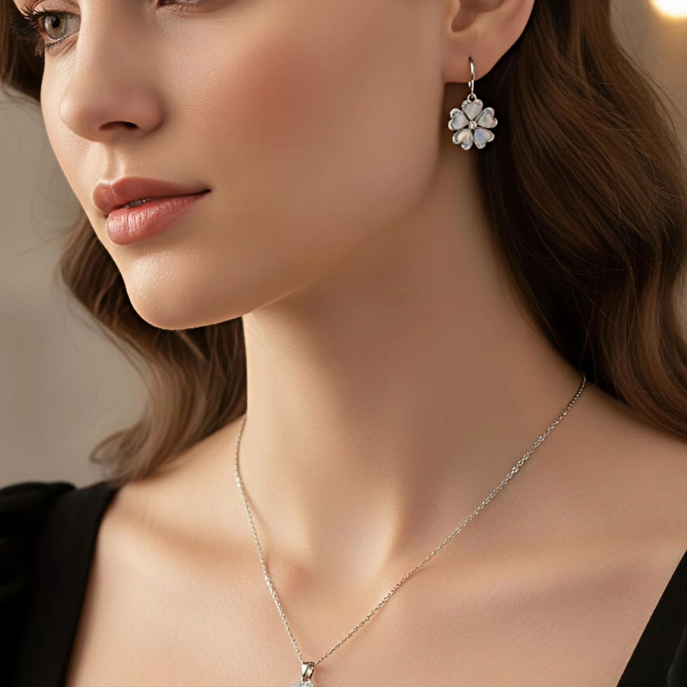Zirkon taşlarla süslenmiş kombin kolye ve küpe yonca tasarımı ve gümüş rengiyle göz kamaştırıcı bir parıltı kazandırırken, kulağa ve boyna yerleşimi şık bir odak noktası sunuyor.