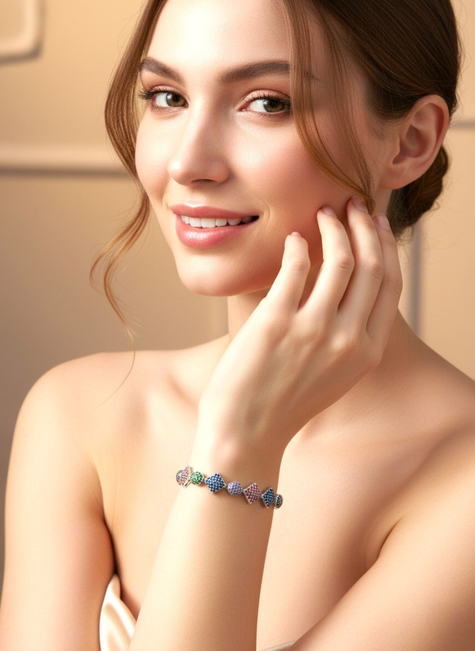- Kare yuvarlak zirkon taşlı bileklik renkleriyle göz kamaştırıcı bir parıltı kazandırırken, bileğe yerleşimi şık bir odak noktası sunuyor.